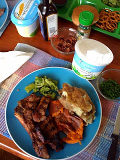 Dinner: Mr. Handsome-and-Handy had a yen for potatoes, and they did sound pretty good. I wanted sweet potato, too, so we cooked up 3 potatoes. I scooped out nearly all of the innards and ate the skins of the sweet potato and one of the russets; the skins have always been my favorite part. Veggies tonight were sort of token on the grown-ups' plates; the kids got most of the broccoli. Thing 2 coveted this particular steak bone, so we swapped.