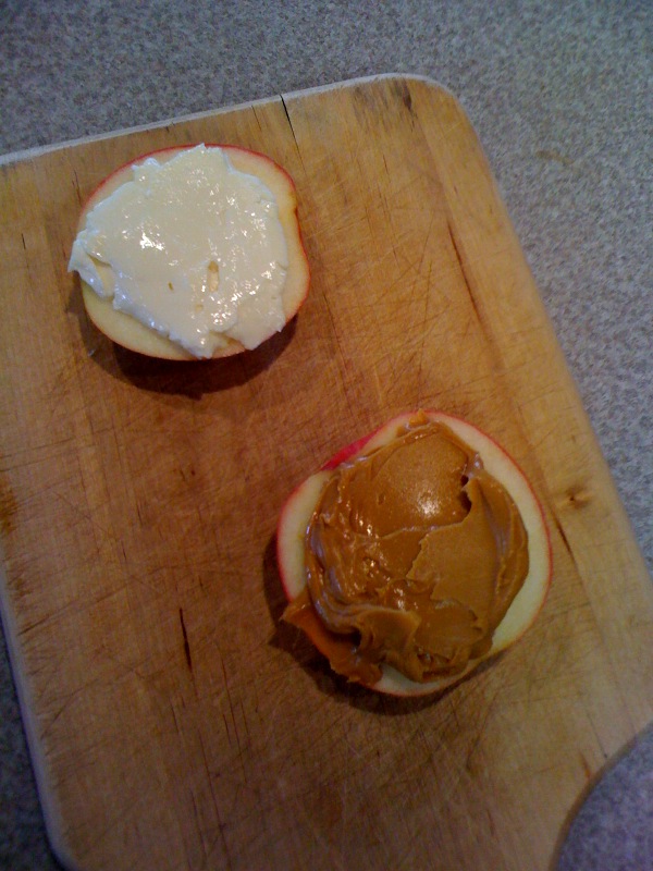 Here are the same apple halves, with their cheese (sadly, we were out of walnuts, Debby!) and peanut butter.